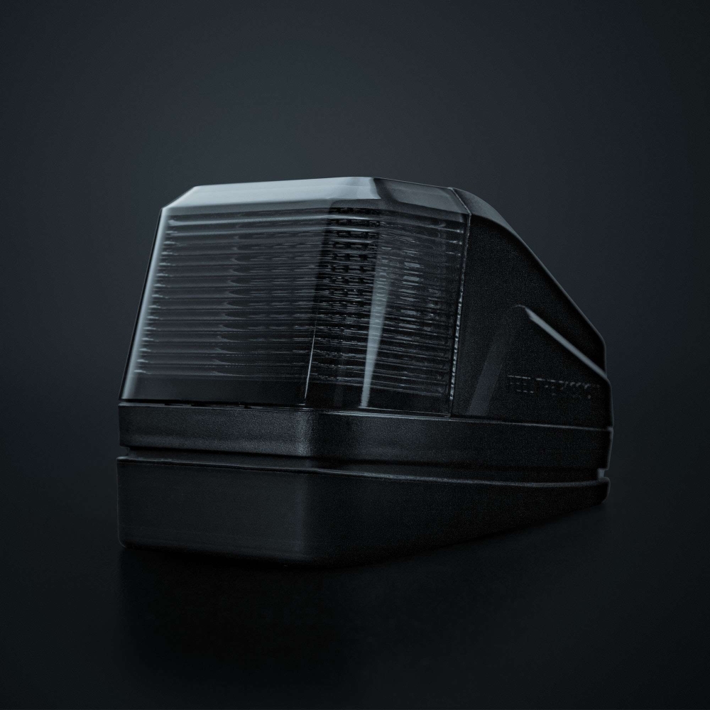 Huset og glasset i polycarbonat giver høj modstandsdygtighed over for stød og vejr, mens IP69K-klassificeringen sikrer beskyttelse mod vand og støv også ved højtryksrensning. Den medfølgende plastikbase og monteringsdetaljer gør hurtig og sikker installation nemmere, og der er mulighed for at bruge vinkelfæste (sælges separat) for fleksibel montering.