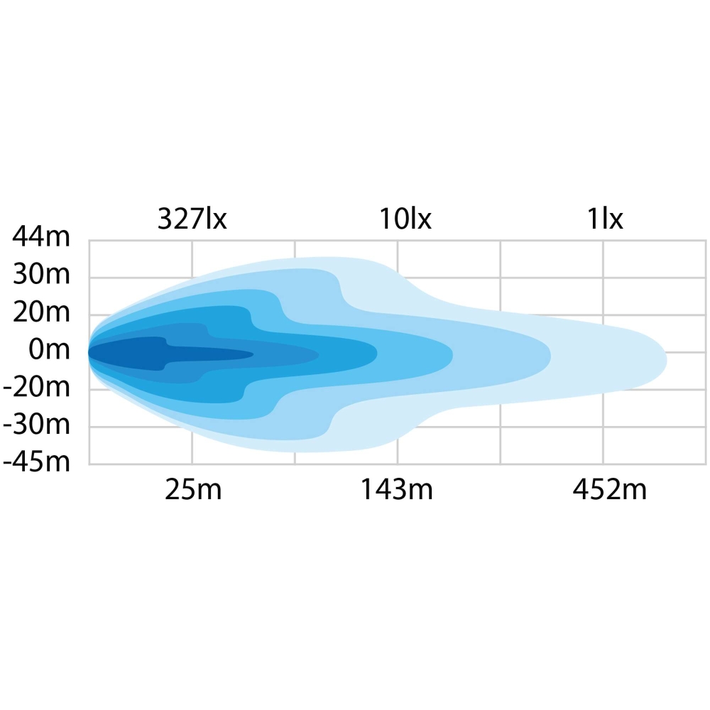 - Udvidet rækkevidde og bredere lysbillede: Se længere og få et dramatisk bredere synsfelt – over fire gange bredere end bilens almindelige fjernlys – hvilket hjælper med at forudse potentielle farer og reagere mere effektivt. Denne løsning har et faktisk lysstrøm på 9500 lumen og belyser 452 meter (ved 1 LUX), hvilket giver enestående sigt.