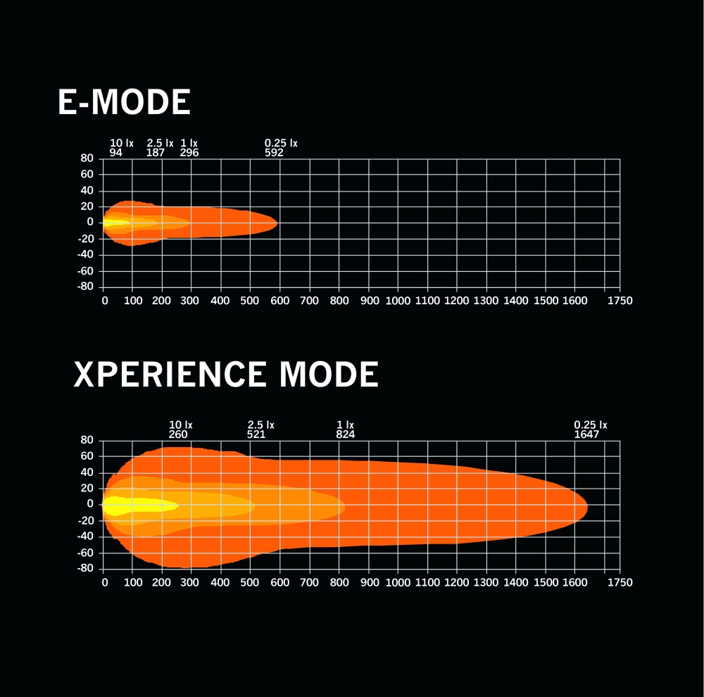 Lygternes langtrækkende lys giver en bred og jævn lysfordeling med 13,6 graders spredning og en rækkevidde på over 800 meter. Xperience-tilstanden giver høj effekt og maksimal sigtbarhed, mens E-tilstanden er godkendt til vejtrafik og har lavere effektforbrug. Positionslysene i hvidt og rav giver tydelig markering uden at forstyrre designet, når de er slukket.