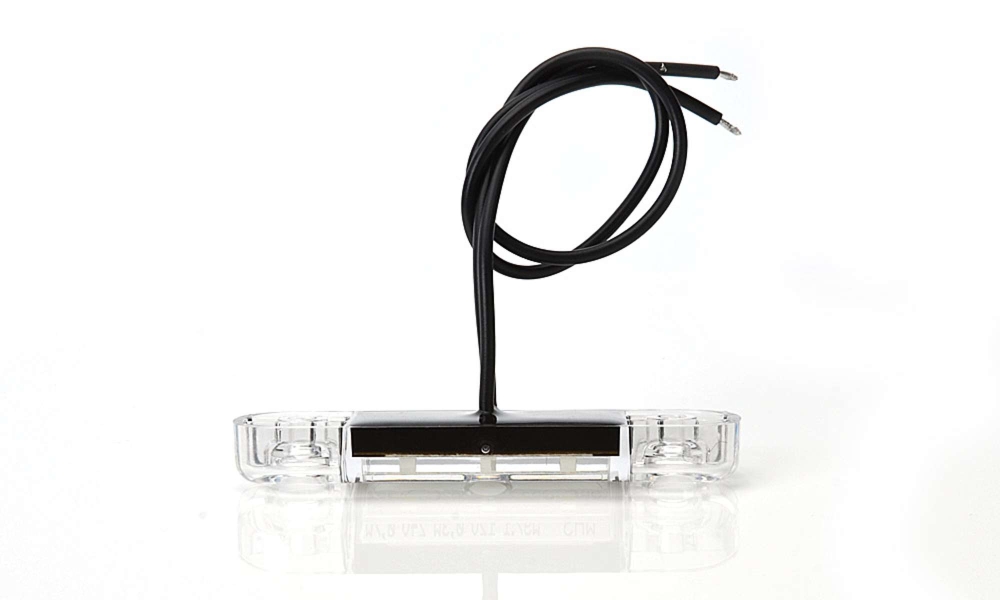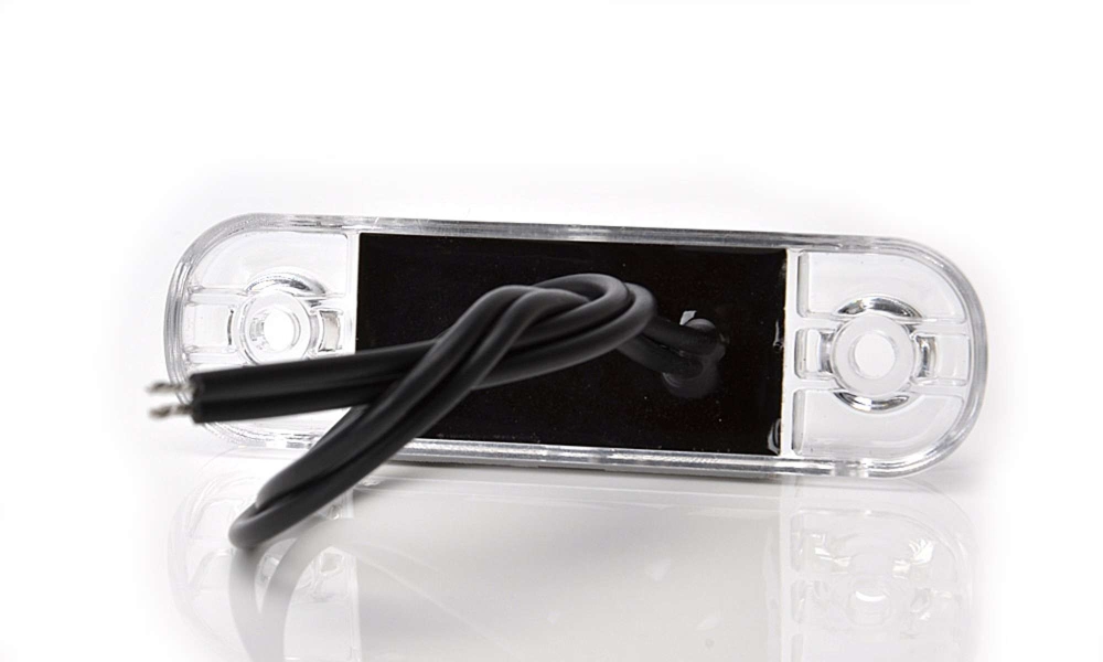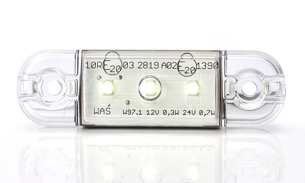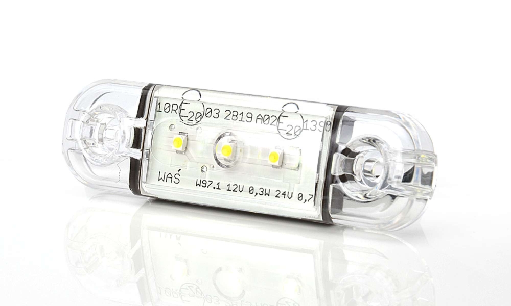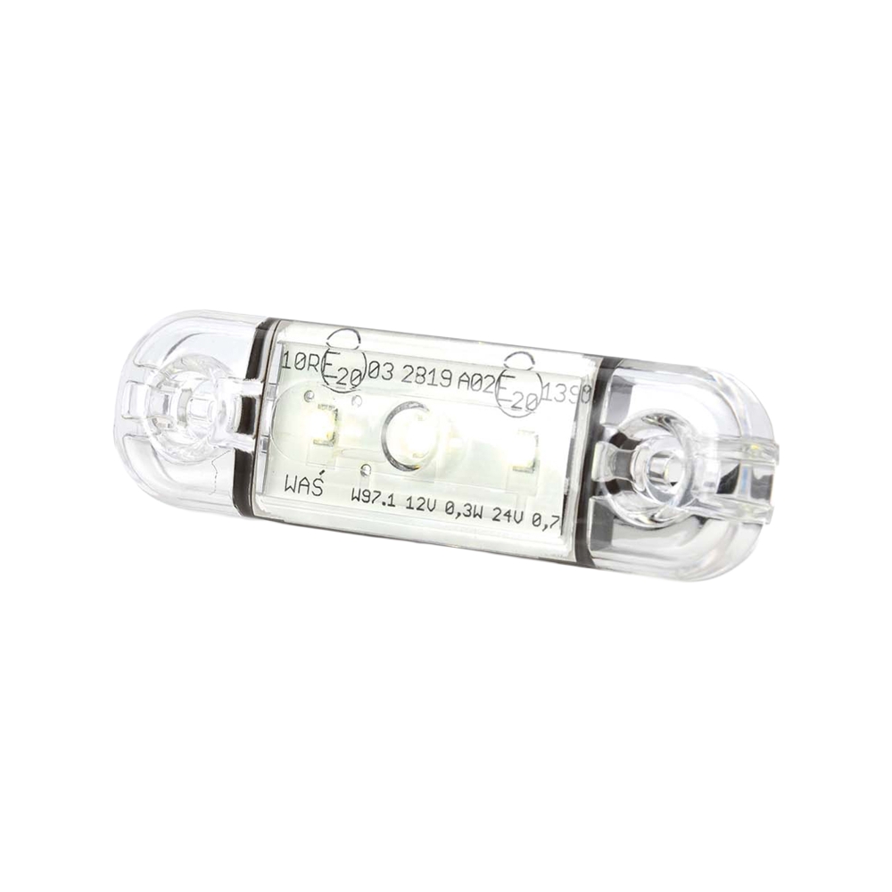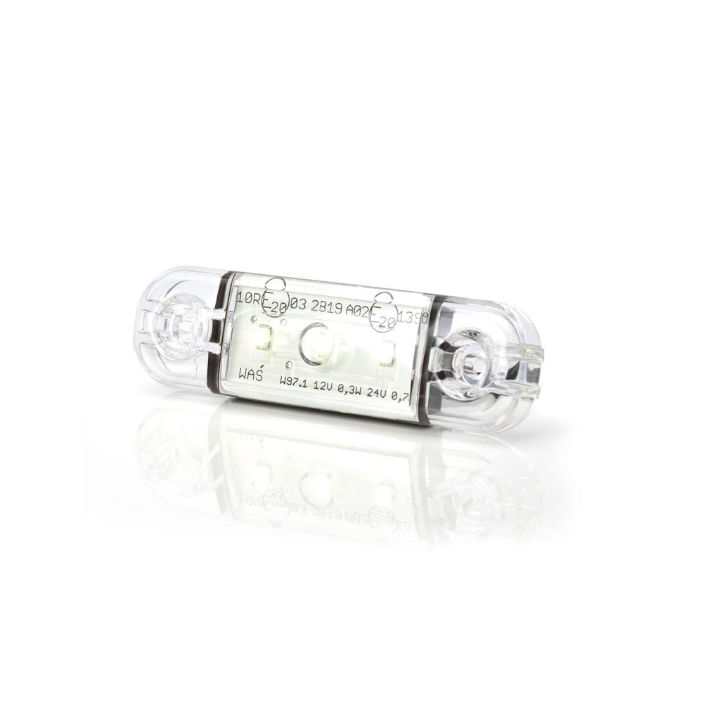 Smal hvid LED-positionslys med 3 dioder og klart glas, nem at installere og brugervenlig.