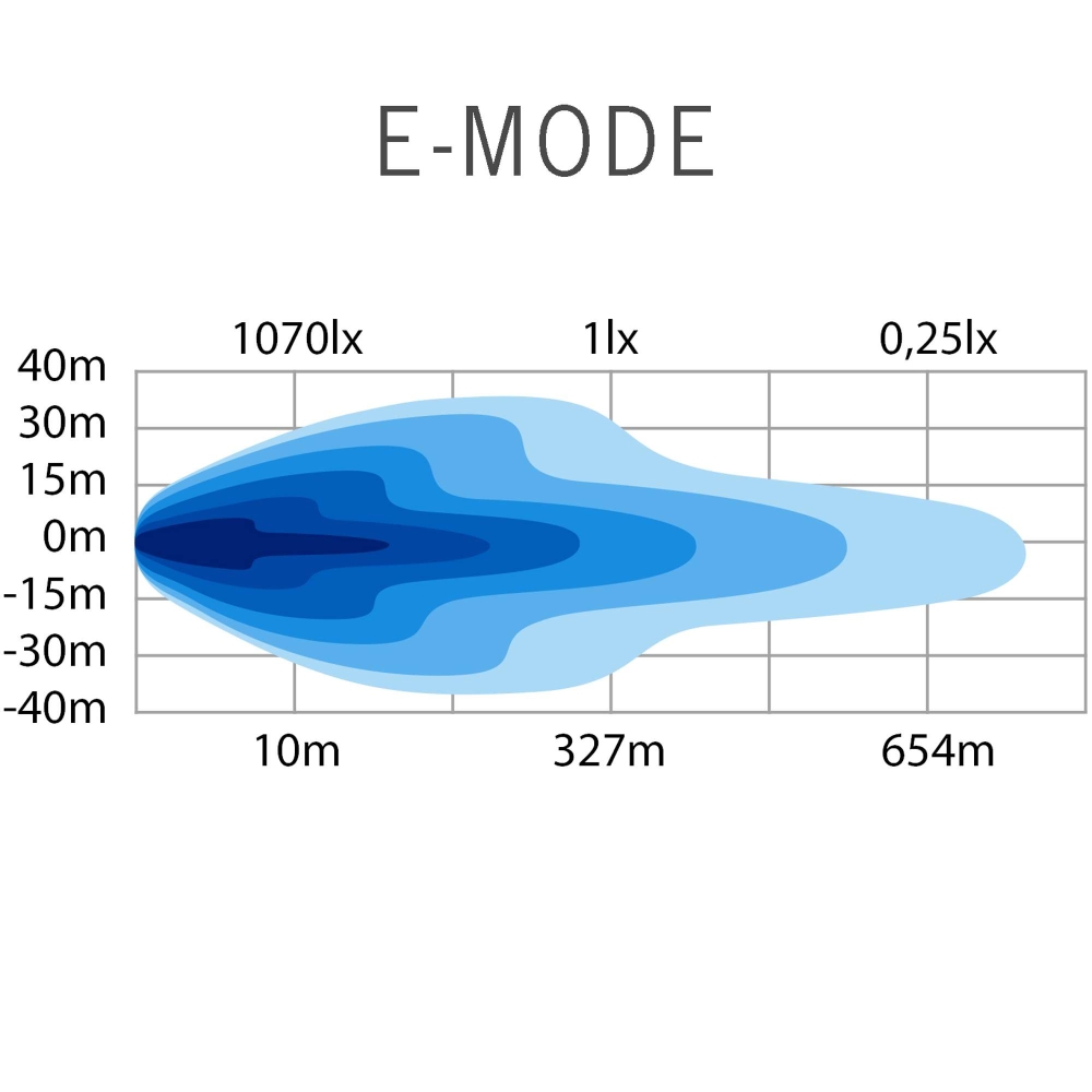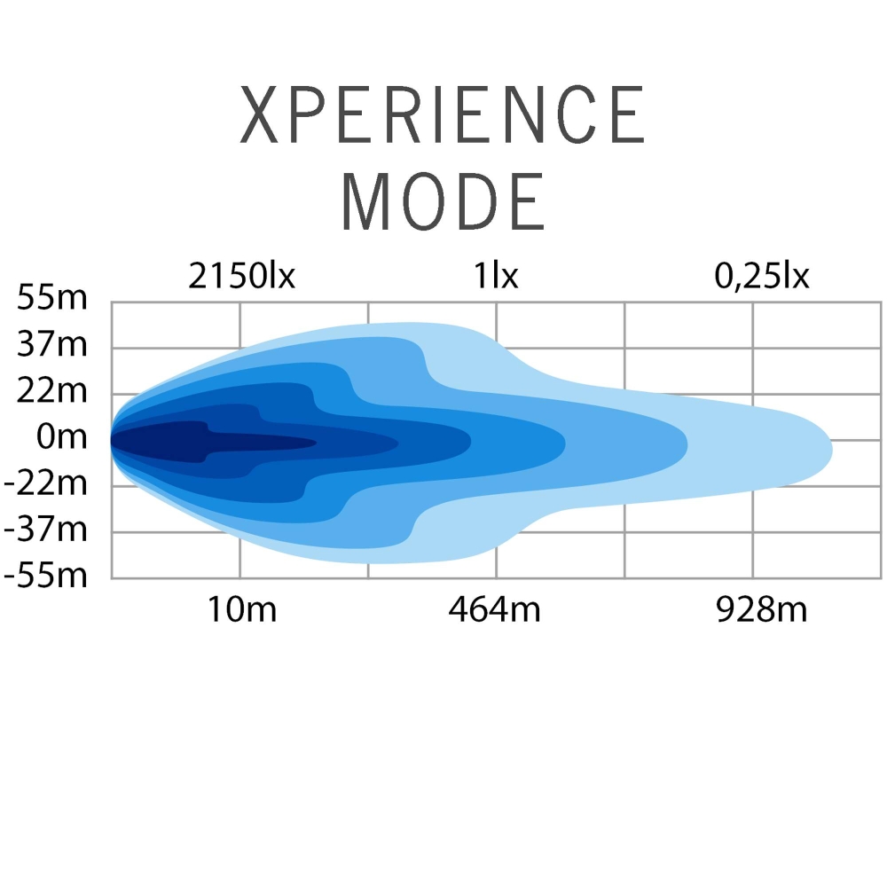 Xperience-tilstanden leverer revolutionerende 5758 faktiske lumen og har et forbrug på 66 W, hvilket giver et bredt, langt og massivt lys i de første 500 meter. Den E-godkendte tilstand skaber også et bredt og kraftfuldt lys på 2788 faktiske lumen og et forbrug på 32 W, hvilket giver dig en fremragende oversigt over omgivelserne.