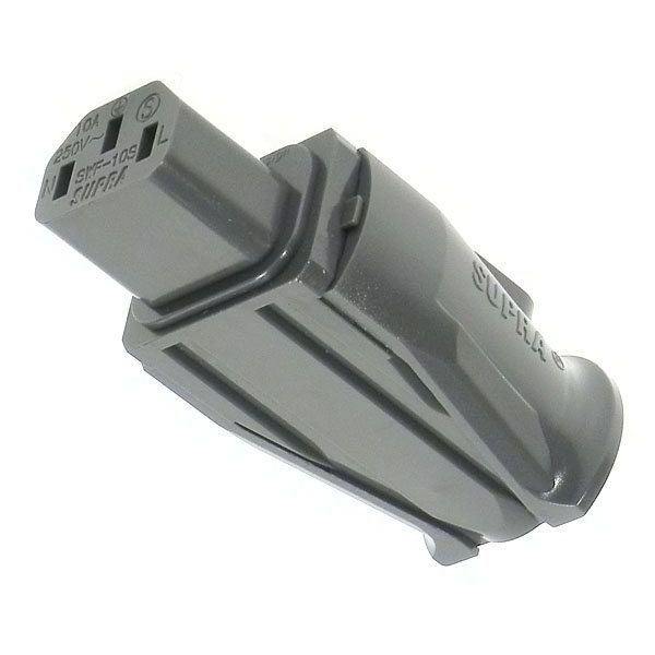Supra LoRad SWF-10s är en patenterad kontakt för montering på nätkablar och avsedd för apparatänden, för 110-240 V, och är säkerhetsgodkänd enligt Audio Grade. Kontakten hanterar kabeldiameter upp till 11 mm och har guldpläterade kontaktstift.