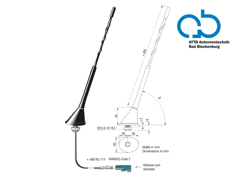 - Antenner med en længde på 230 mm og en installationsdybde på +/- 15 mm.