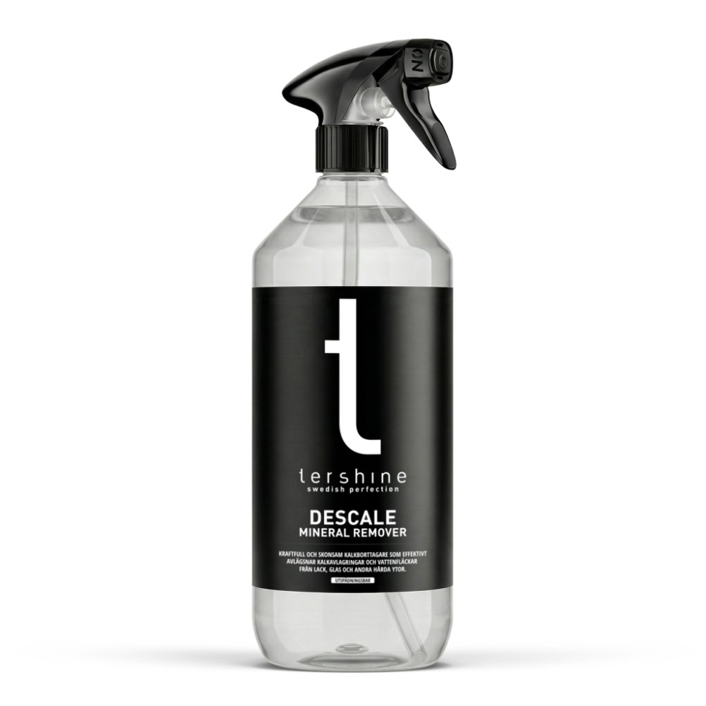 Tershine Descale - Kalkfjerner er et kraftigt men skånsomt, fosfatfrit kalkfjerner udviklet til effektivt at opløse kalkaflejringer og vandpletter fra hårde overflader. Perfekt til brug på lak, glas og andre holdbare materialer, både på køretøjer og i hjemmet. Uanset om du har problemer med kalkpletter på bilens lak, vandmærker på ruder eller stædige aflejringer i badeværelse og køkken, hjælper Descale dig med at genskabe overfladen til sin oprindelige tilstand.