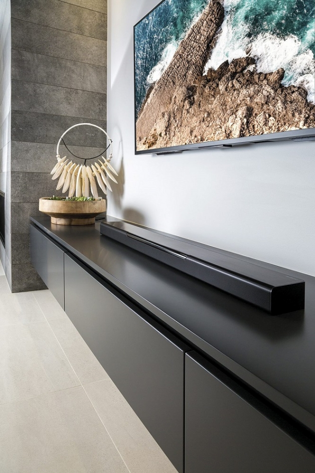 Det smidiga formatet på limpan gör att du faktiskt kan placera den framför TV:n utan att den skymmer bilden. Den utformning gör att den designmässigt passar moderna TV-apparater. Likaså får du även möjligheten att montera limpan på väggen så att den smälter in snyggt i ditt hem.